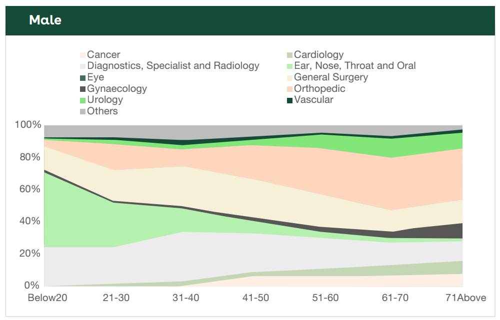 Changes to the types of treatment we need as we age affect our premiums. The cost of treatments required by older people tend to be more expensive than those of younger people. The graphs below illustrate our changing needs for treatment. One is for men and the other for women, where both show the changes in treatments we require as we age.