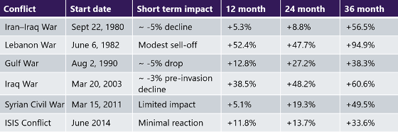 Across nearly every major Middle East conflict in modern market history, investors who stayed invested were better off 12, 24, and 36 months later.