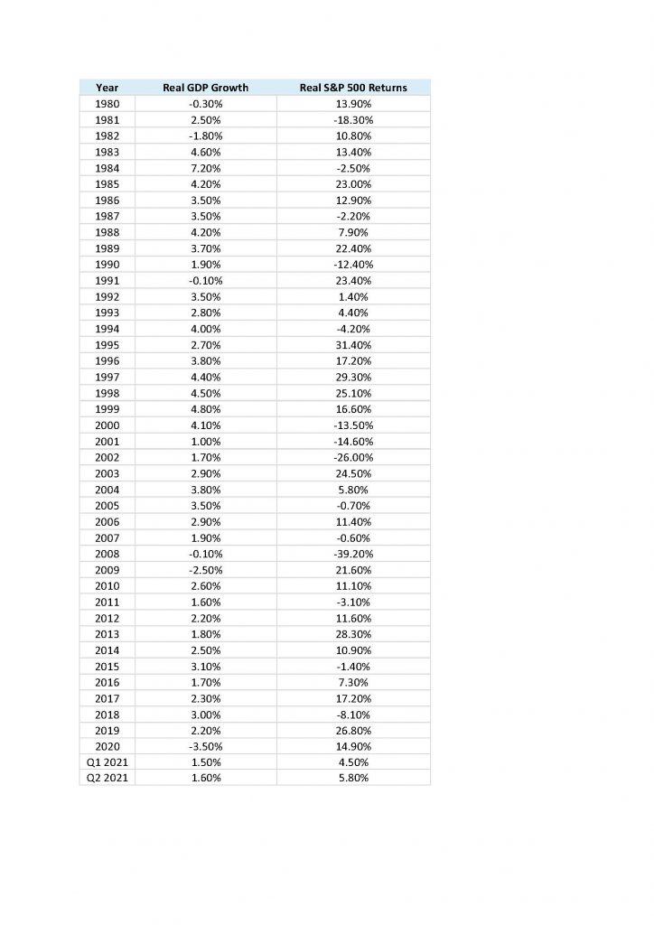 Here’s how annual GDP growth and S&P 500 Index returns stack up from 1980 to the second quarter of 2021. Both metrics are net of inflation.