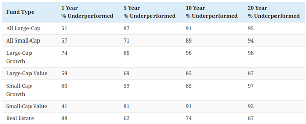 Over a 20-year period, 95% of large-cap actively managed funds have underperformed their benchmark.